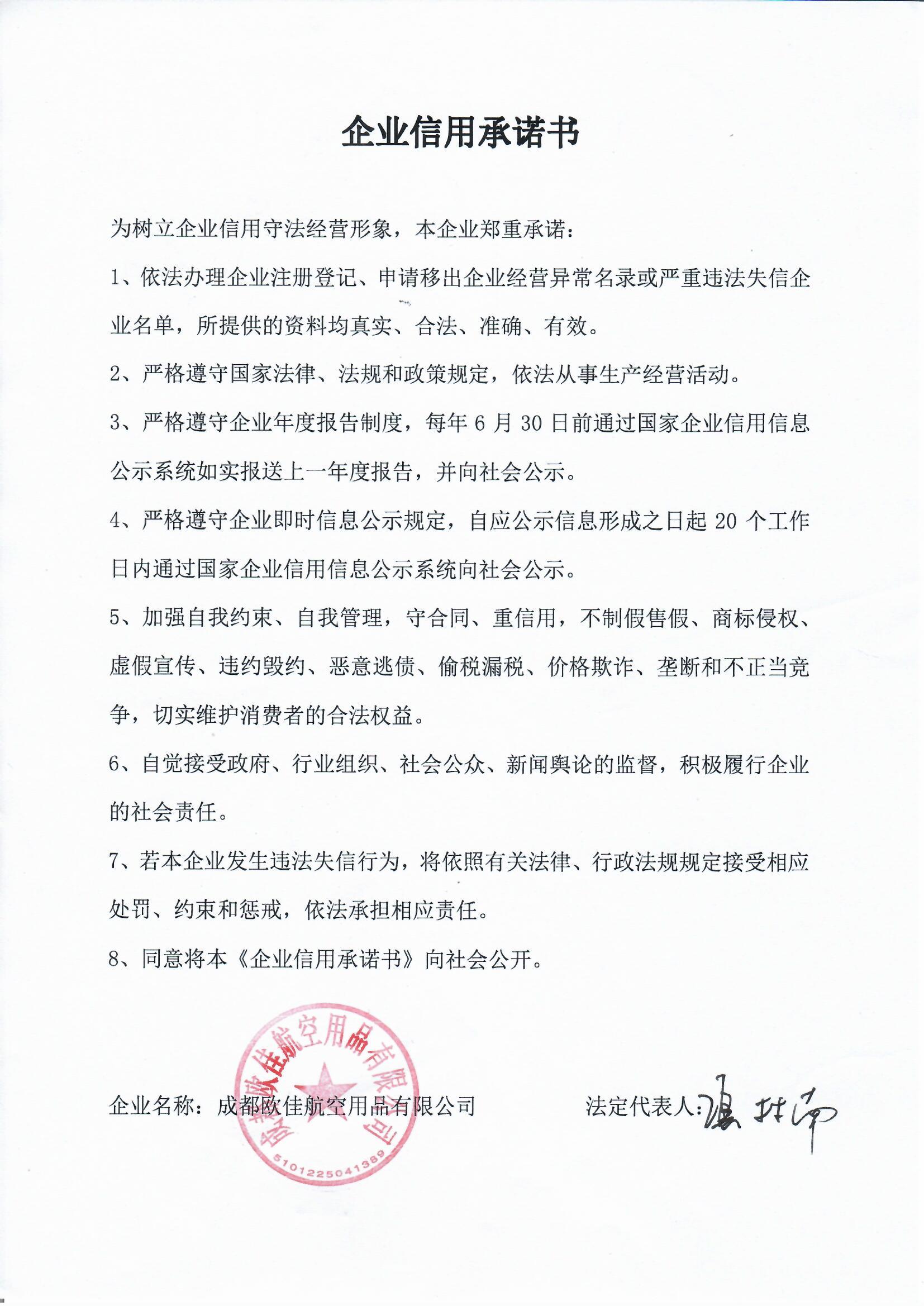 成都欧佳航空用品有限公司企业信用承诺书