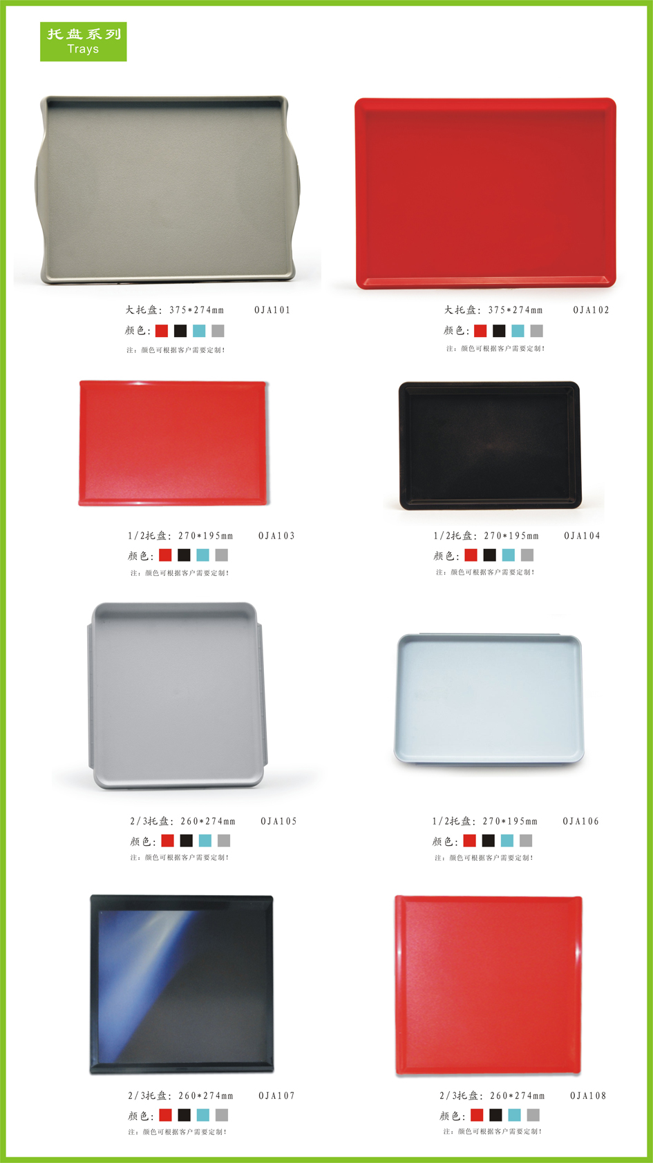 托盘 主要采用进口食品级ABS工程塑料,防火阻燃达到V0-级,此材料具有较好的抗冲击强度及韧性力度,主要特点是无毒,无味,吸水率低,耐磨性,耐化学药性,表面光泽等良好的综合物理机械性能。我司托盘设计新颖,且具有防滑、稳定、耐用等功能。另外款式较多,有大托盘、小托盘和中托盘等,客户可根据需求随机调配各种形状和颜色的托盘。